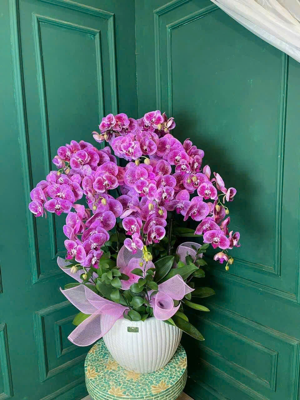 Chậu lan hồ điệp hồng được kết hợp hài hòa bởi màu hoa và các phụ kiện. Những nhà thiết kế đã lựa chọn những cành hoa đẹp nhất, mập mạp và khỏe mạnh nhất. Lá cây có độ dày vừa phải. Cây đang ở độ tuổi đẹp nhất. Cây lan hồ điệp màu hồng được trồng trong chiếc chậu sứ màu trắng vừa đẹp vừa sang trọng.