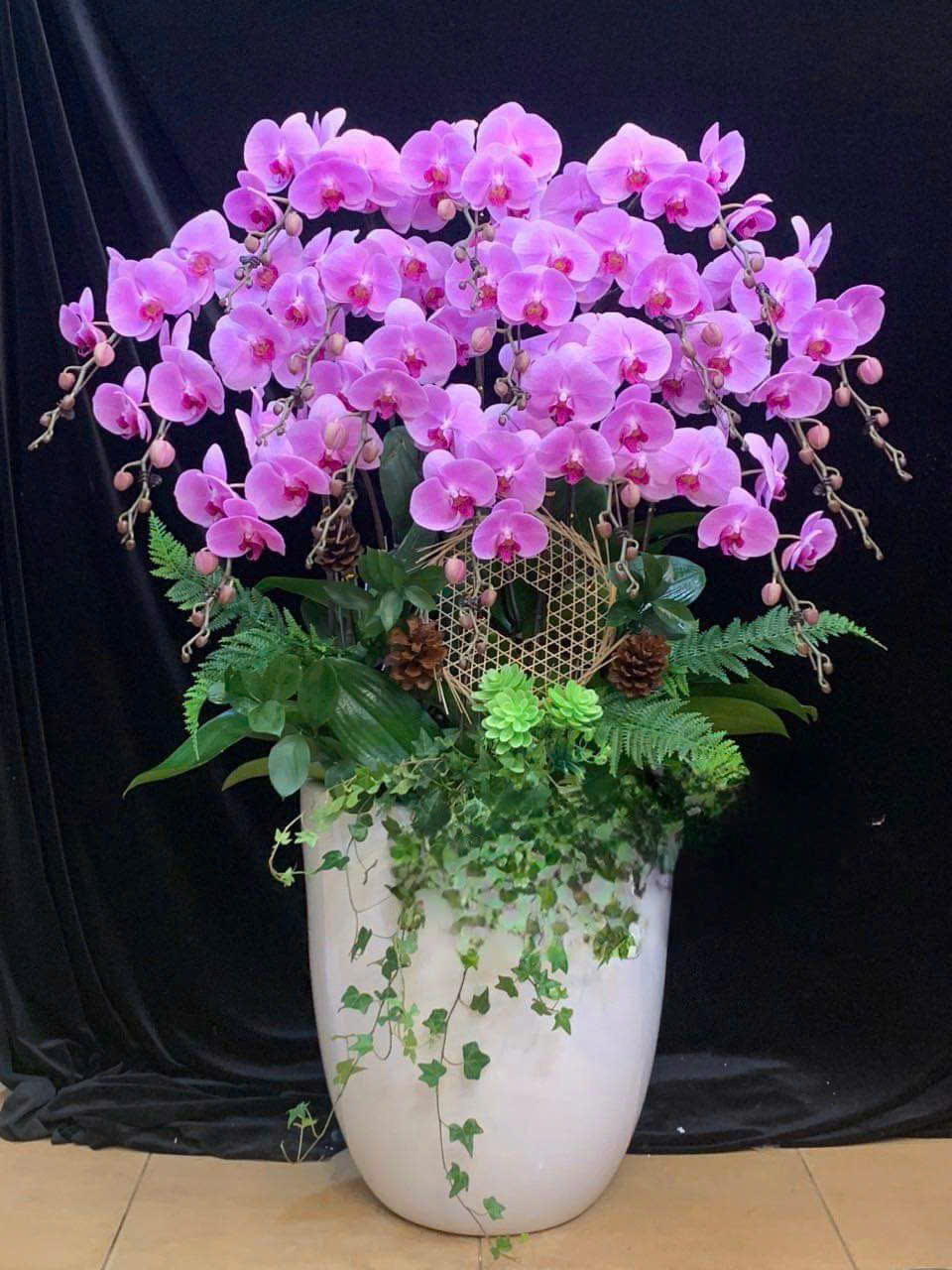 Chậu lan hồ điệp hồng được kết hợp hài hòa bởi màu hoa và các phụ kiện. Những nhà thiết kế đã lựa chọn những cành hoa đẹp nhất, mập mạp và khỏe mạnh nhất. Lá cây có độ dày vừa phải. Cây đang ở độ tuổi đẹp nhất. Cây lan hồ điệp màu hồng được trồng trong chiếc chậu sứ màu trắng vừa đẹp vừa sang trọng.