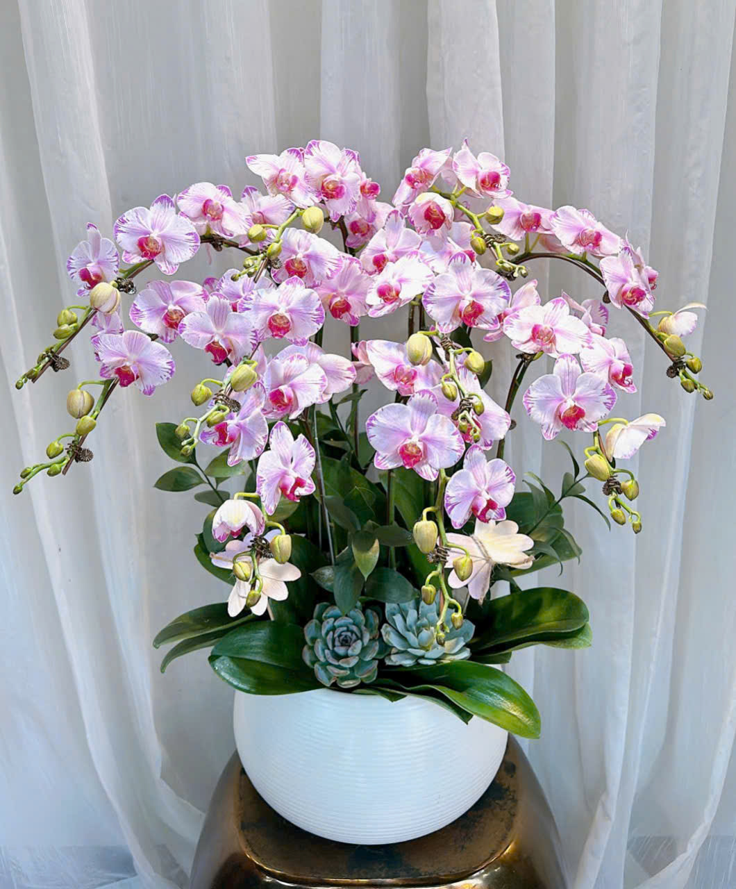 Chậu lan hồ điệp hồng được kết hợp hài hòa bởi màu hoa và các phụ kiện. Những nhà thiết kế đã lựa chọn những cành hoa đẹp nhất, mập mạp và khỏe mạnh nhất. Lá cây có độ dày vừa phải. Cây đang ở độ tuổi đẹp nhất. Cây lan hồ điệp màu hồng được trồng trong chiếc chậu sứ màu trắng vừa đẹp vừa sang trọng.