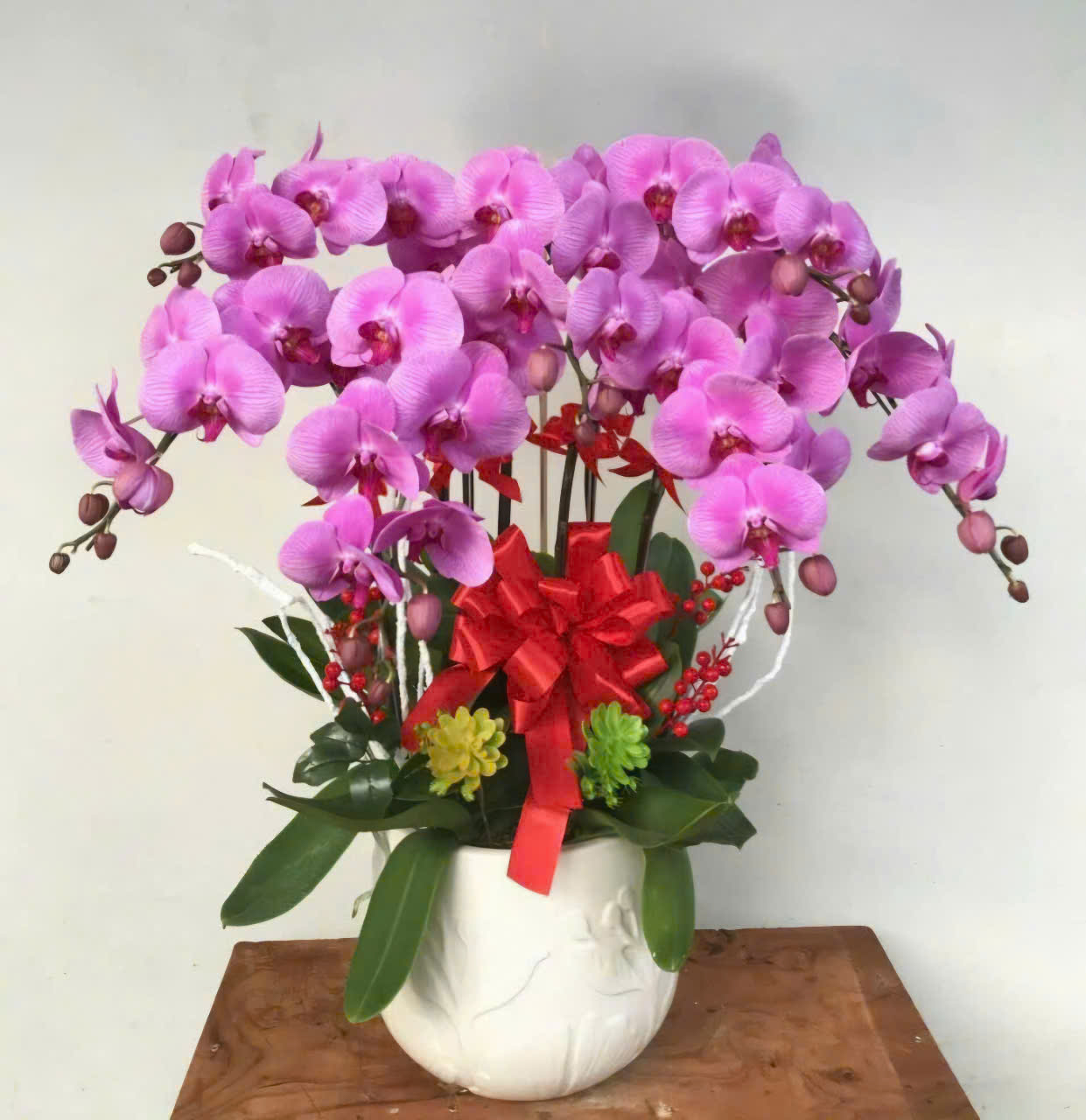 Chậu lan hồ điệp hồng được kết hợp hài hòa bởi màu hoa và các phụ kiện. Những nhà thiết kế đã lựa chọn những cành hoa đẹp nhất, mập mạp và khỏe mạnh nhất. Lá cây có độ dày vừa phải. Cây đang ở độ tuổi đẹp nhất. Cây lan hồ điệp màu hồng được trồng trong chiếc chậu sứ màu trắng vừa đẹp vừa sang trọng.