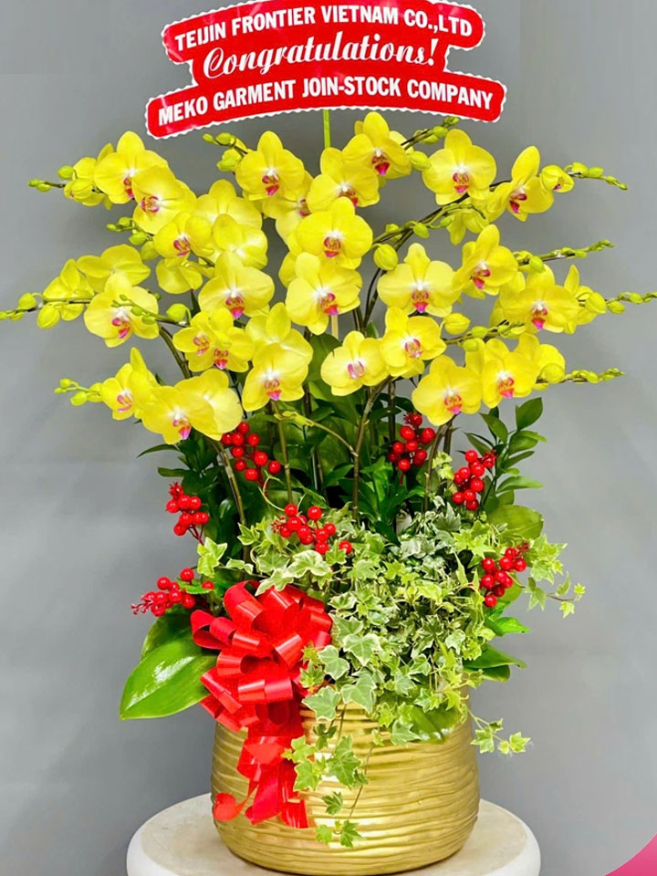 Chậu Lan Hồ Điệp Vàng Hải Phòng được thiết kế và ghép bởi Shop Hoa Tươi ở Hải Phòng. Hoa lan hồ điệp Vàng từ lâu đã trở thành biểu tượng của sự sang trọng và đẳng cấp. Với cánh hoa mỏng manh nhưng quyến rũ, lan hồ điệp Vàng không chỉ đẹp về hình thức mà còn mang nhiều ý nghĩa tinh tế. Chậu hoa lan hồ điệp màu Vàng thường được chọn làm quà tặng trong các dịp quan trọng hoặc dùng để trang trí không gian sống, làm việc, thể hiện sự thịnh vượng và may mắn.